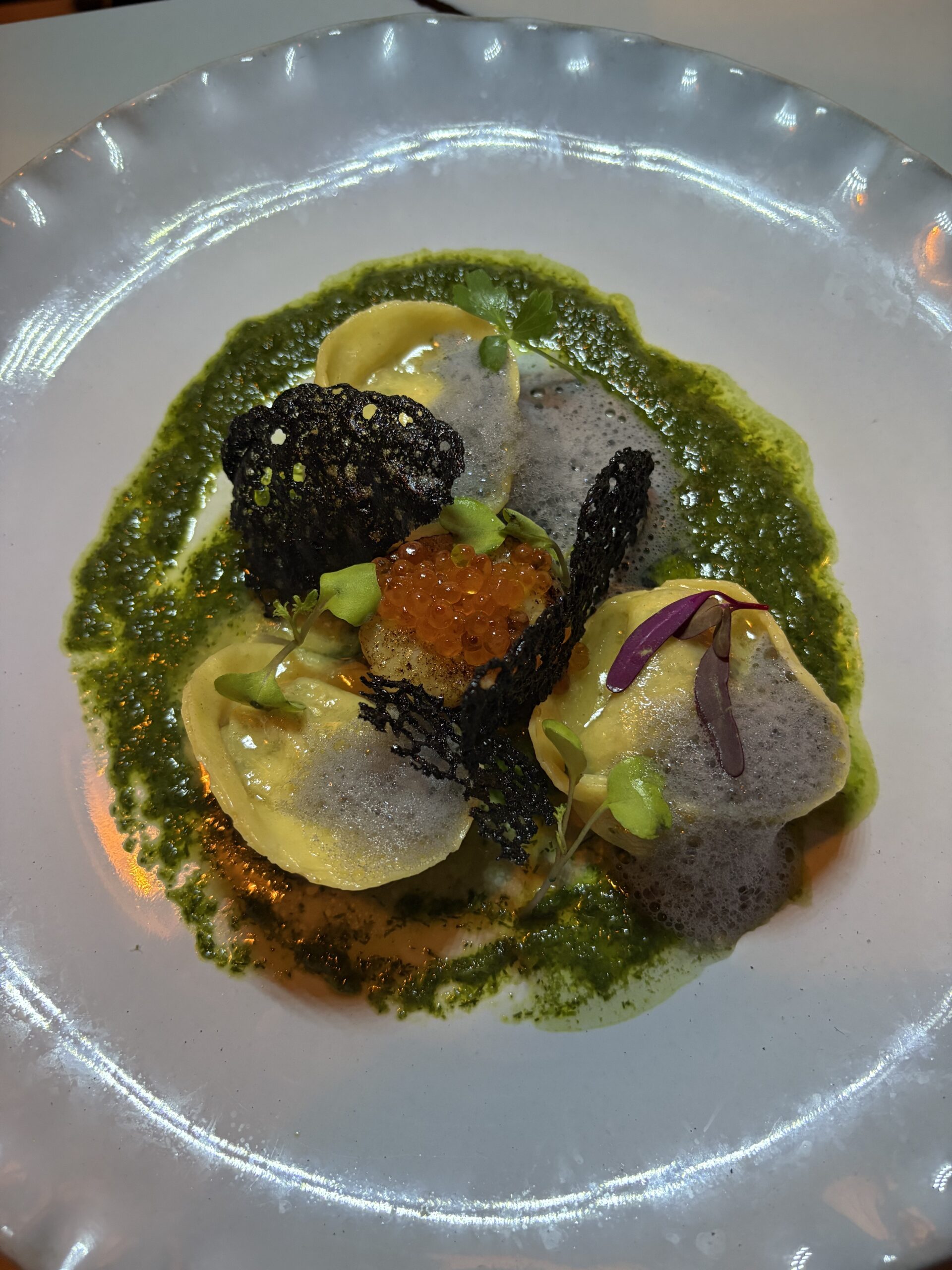 Description: Poseidon’s Bounty showcases the God of the Seas’ greatest creations. Seared scallops with trout roe served alongside a crab stuff cappelletti pasta with lemon and charcoal seafoam, coral tuiles and a dill pistou.
