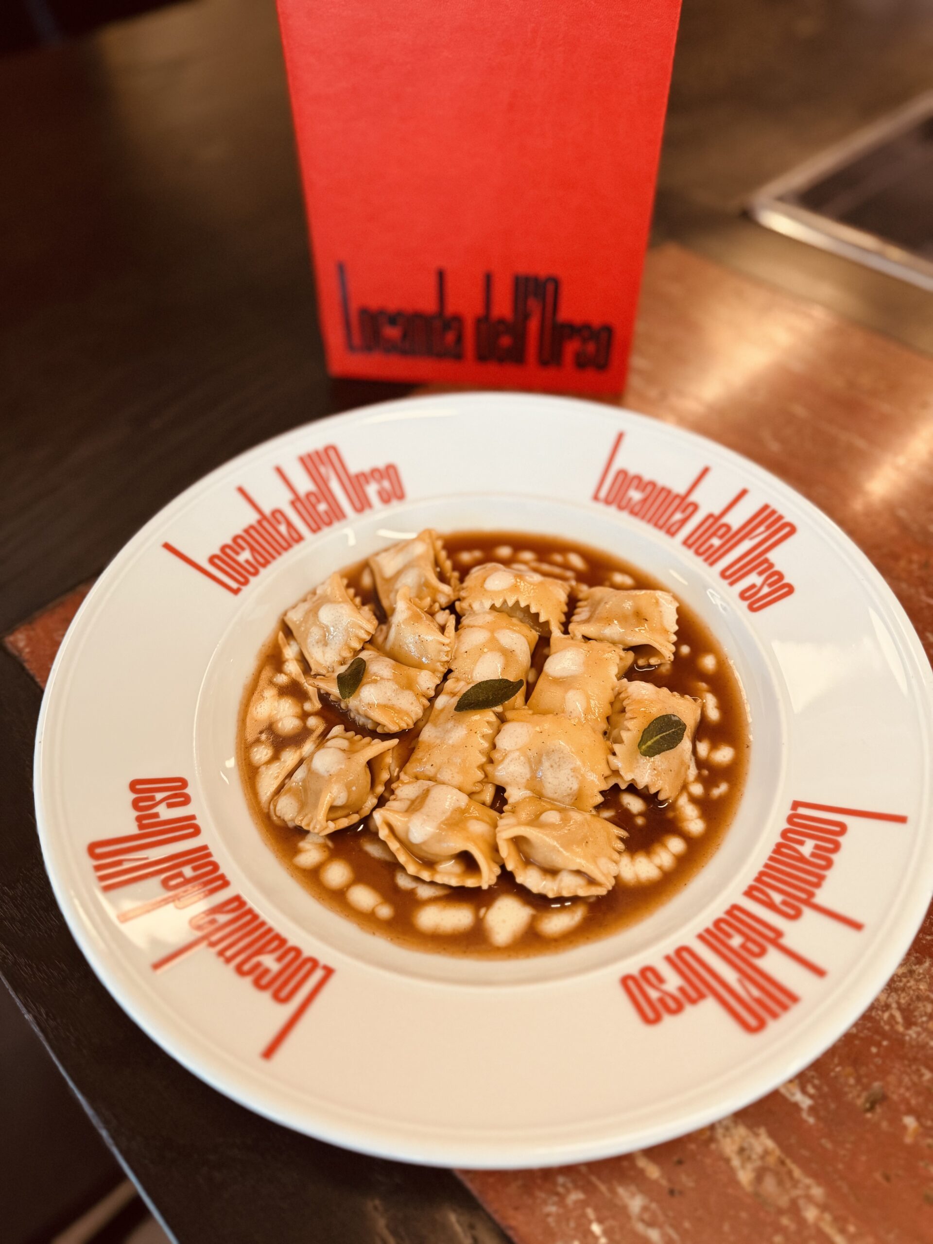 Description: filled pasta with slow braised veal ossobuco, meat juice and Parmesan sauce.