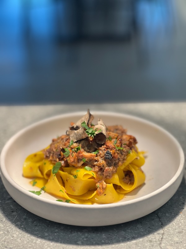 Description: Veal Ossobucco smoked then slow braised in white wine to make a Ragu. We add Guancale, Fresh local Chantrelle Mushrooms served over Saffron stained Pappardelle noodles and finish with shavings of FRESH Tartufo Nero (black Truffle) imported from Umbria.