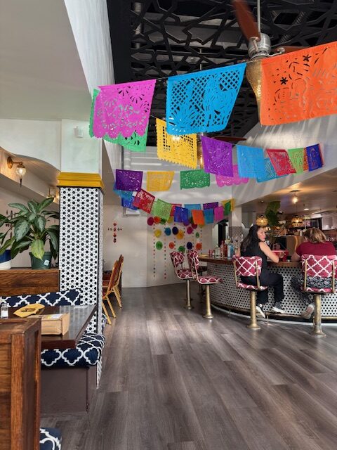 The restaurant features a bright interior with colourful hangings representing the region of Mexico and their cuisine.