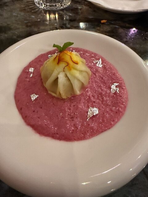 5th course: Ukadliche modak and cranberry pudding, a glorious dumpling sits as the star of the plate.