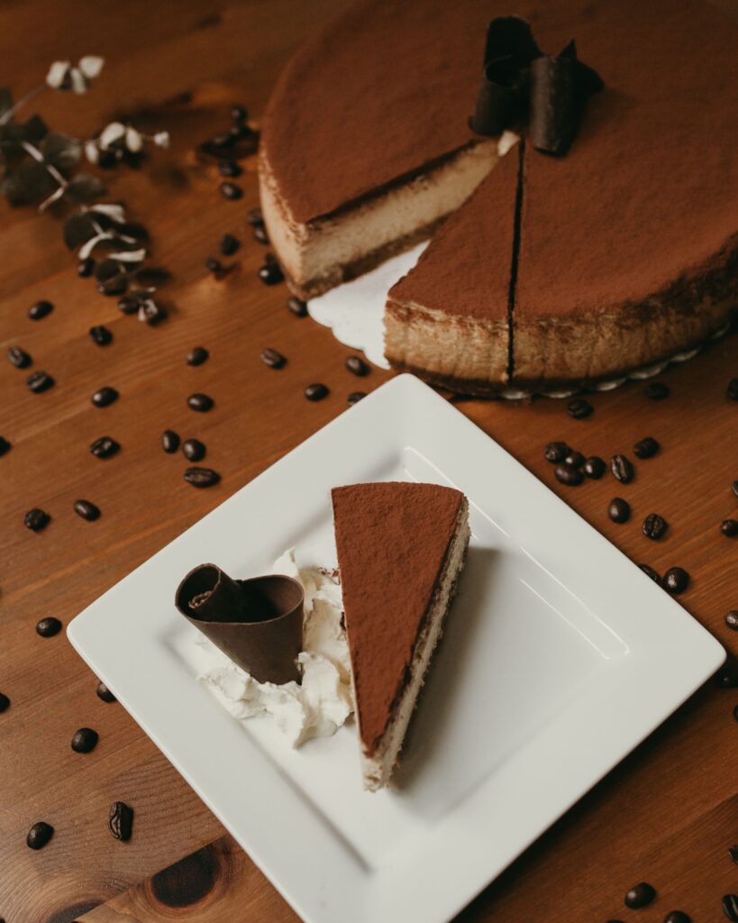 Description: A smooth and dreamy fusion of two classics. Made with real cream cheese, mascarpone, vanilla bean, sour cream, and Bailey’s non-alcoholic coffee creamer, this cheesecake captures the spirit of a traditional tiramisu in every bite. We blend Trablit coffee extract for a deep espresso flavour, layer it over a buttery crumb crust, and finish with dark chocolate shavings and a soft dusting of cocoa powder.