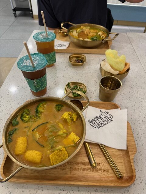 I drove to East Van to Super Thai Hot Pot ((3327 Kingsway) for dinner and Lawrence joined me this time. They specialize in self-serve Malatang style hot pot where you choose your own selections from over 100 ingredients which is then weighed at the cashier at $18.49 per pound. You then choose your broth from the selection of Thai broth flavours. I had the Coconut Curry broth and Lawrence had the Fish Maw Chicken broth.