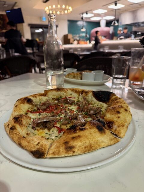 Duck Confit pizza with taleggio cheese, red pepper and roasted garlic