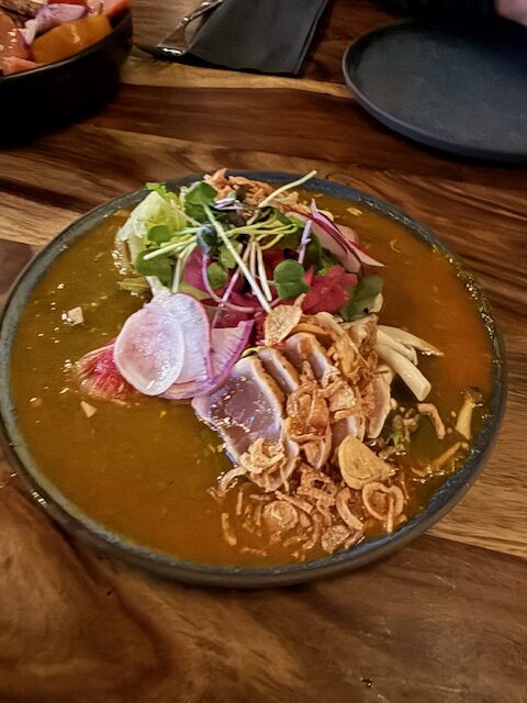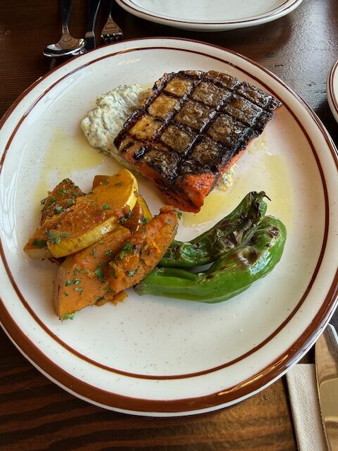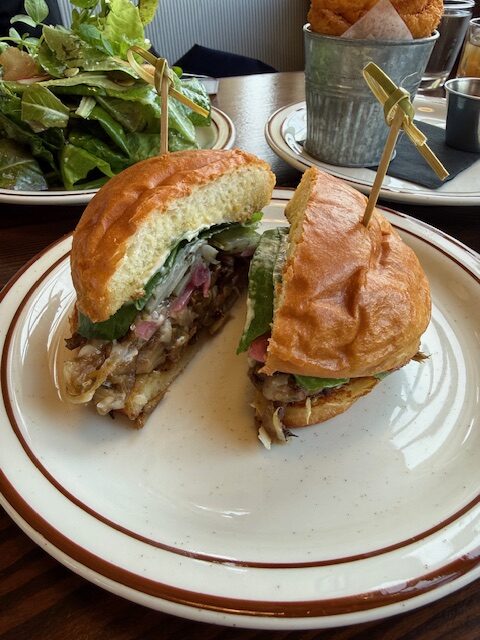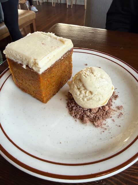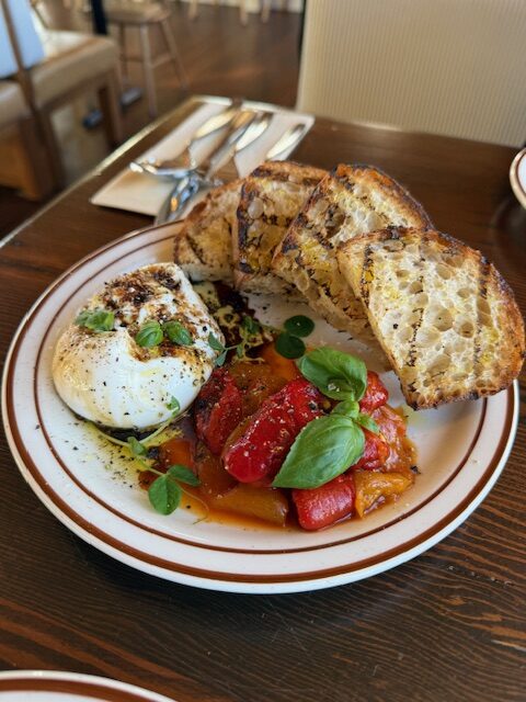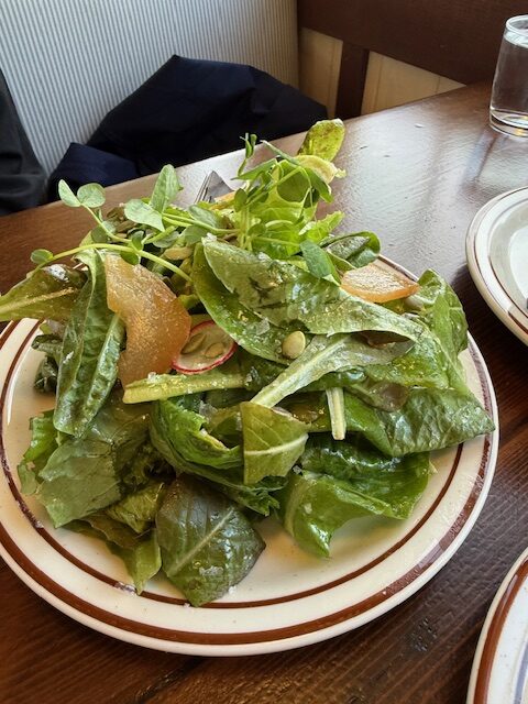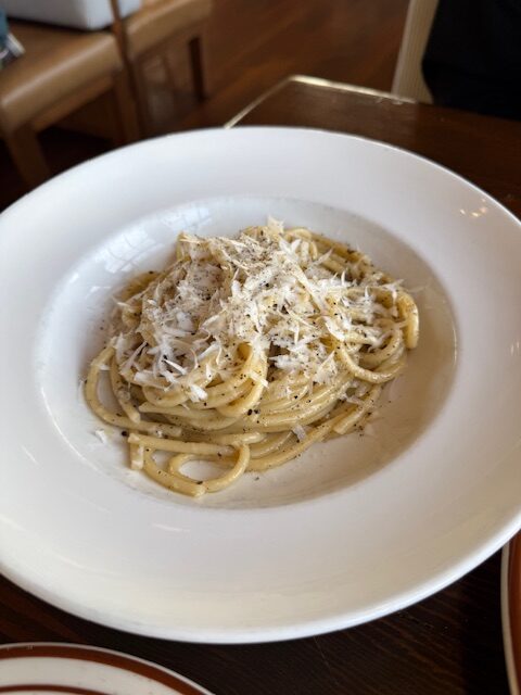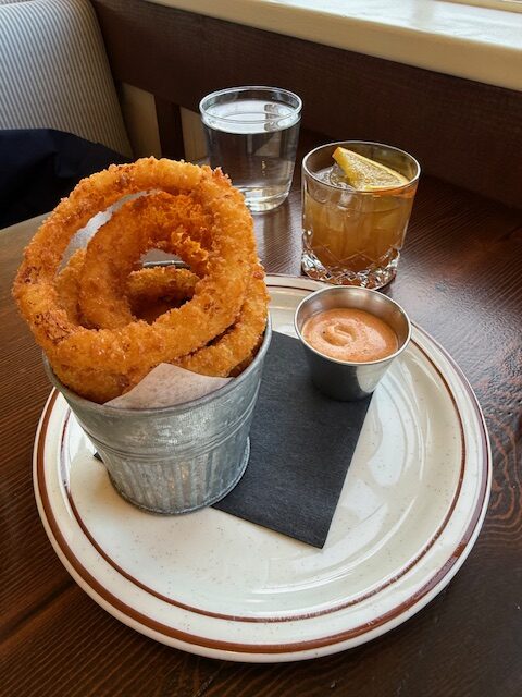 We shared these dishes Italian Burrata Peperonata, The Forager burger, Bucatini Cacio e Pepe, Spring salmon, Onion Rings, Salad, and Carrot cake to finish.