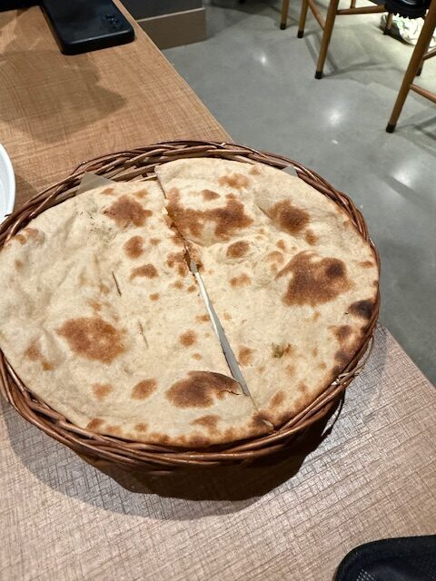 Then the Malvani Black Chickpea Stew which I loved, in a caramelized coconut and onion sauce served with wade (fried bread) for dipping; as well as the Chicken Bhujing is another dish which I loved with flattened rice, compressed chicken and chicken rassa and we were instructed to mix it all up ourselves; this dish is from Chef Tushar’s home town. We also had an order of the Tandoori roti (wholewheat).