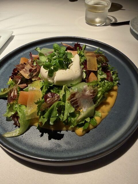 36 Months 5J Cinco Jotas, Salade Maison, Persimmon Puree, Maple Poached Pear, Pickle Honeydew, Smoke Maldon, Extra Virgin Olive Oil
