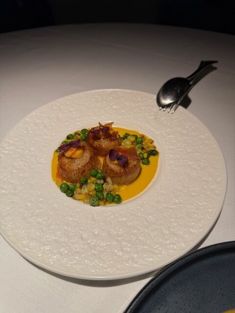 Hokkaido U12 Scallops, Pumpkin Puree, Green Pea, Corn, N’duja Aioli, Finger Lime, Prosciutto Crisp, Smoke Paprika Oil