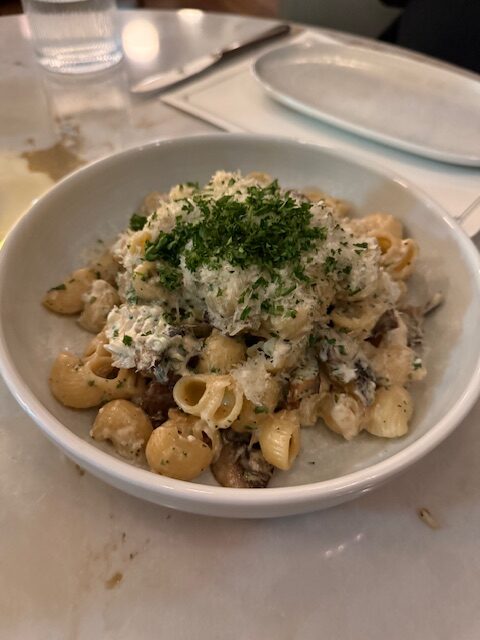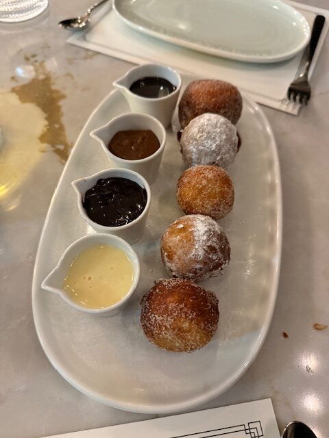 To begin, we had the healthy Seared west coast albacore tuna; followed by the Organic chicken Escalope arugula salad (chicken that was pan-fried was at the the bottom and topped with the salad) and then the rich Wild mushrooms and goat cheese pasta (this is one to share, don’t go it alone). I loved the interactive, playful take on the Italian Zeppole that were chocolate filled and came with 4 dipping sauces (my favourite was the caramel), I shared, but don’t share.