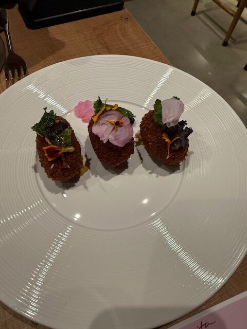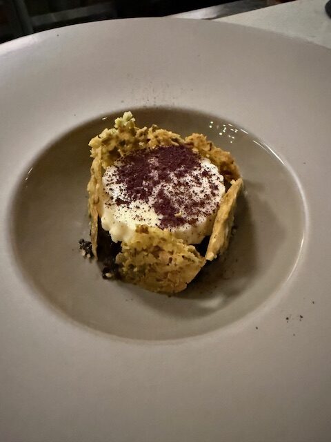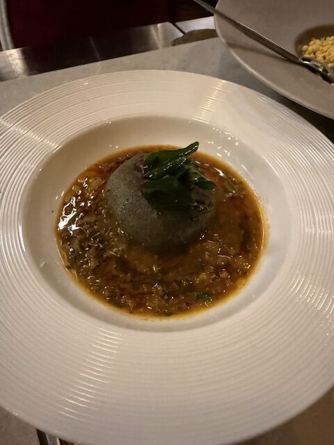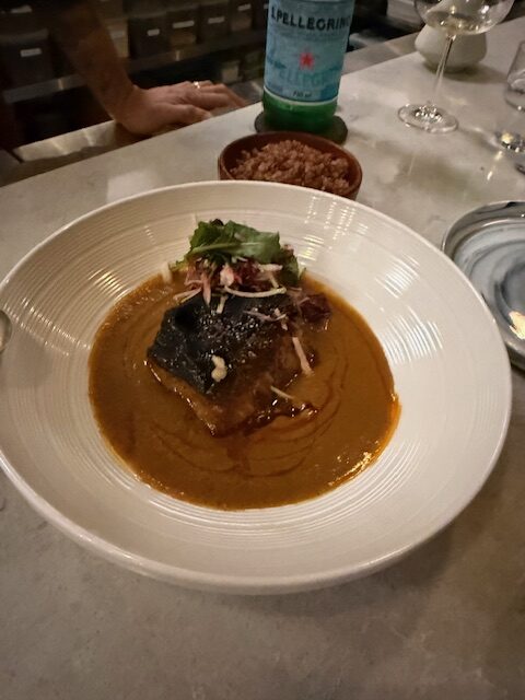 My favourite of the mains were the Malvani Black Chickpea Stew which I loved, in a caramelized coconut and onion sauce served with wade (fried bread) for dipping; as well as the Mangalorean Sablefish Curry; Tesfa Farm Paneer Saag and the Chicken Bhujing which was served with flattened rice, compressed chicken and chicken rassa and we were instructed to mix it all up ourselves; this dish is from Chef Tushar’s home town.