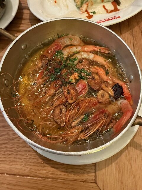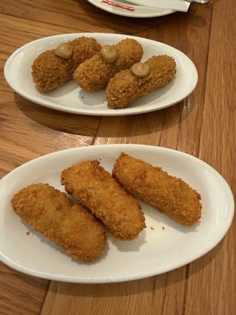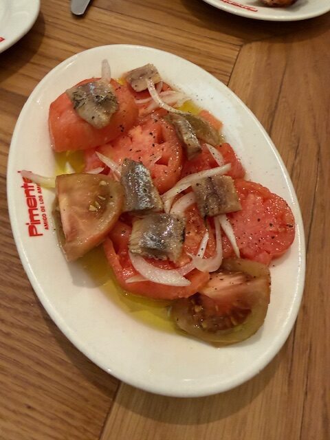 We all had dinner at Bar Pimentel @elbarpimentel a well known compact tapas bar with an emphasis on Andalusian flavors, it delivers well-executed small plates—jamón, marinated seafood, and traditional stews. The ambiance is lively and informal, encouraging shared plates and extended conversation over vermouth or Spanish wine. The 3 of us shared Coca bread, Roast chicken croquette, Mushroom croquette, Tomato salad with smoked sardines, Cod fritters, Fish cannelloni with bechamel and shrimp sauce, Gambas and garlic and Mushrooms dish.
