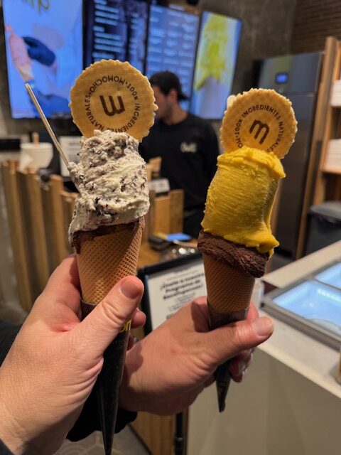 Down the street was Momocho Ice Cream @momocho.icecream  and this dessert-focused shop presents ice cream with playful branding and bold flavors. The texture is creamy and indulgent, often incorporating mix-ins or layered flavor profiles that appeal to a younger, trend-oriented audience. We stopped in for a couple of cones for dessert, Stracciatella for me and the Mango for Lawrence.