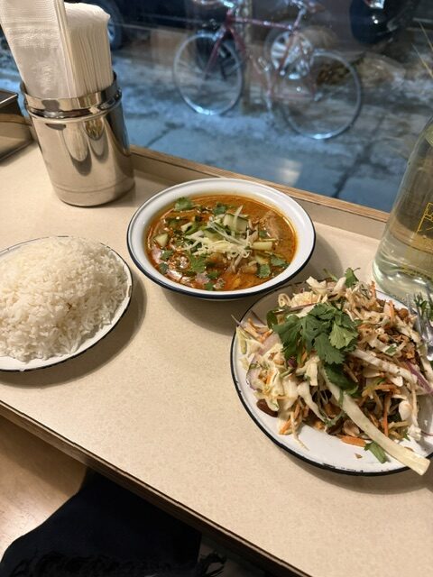 Started my eating adventure for dinner on a very cold snowy night at Épicerie Pumpui with the Herbal cabbage and carrots Salad and the Massaman curry with chicken.