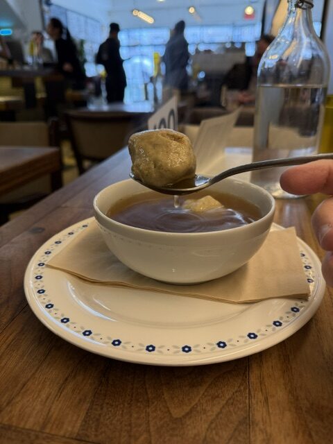 Another cold, snowy day another Uber and this time I headed to the Mile End neighbourhood for lunch to Chez Greenberg, a popular Jewish deli where I had a bowl of their Matzah Ball soup. One thing that I discovered was that their broth is vegan and the matzah ball is vegetarian.